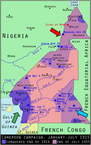 ThexFrench (see map) were the first to attack Kamerun. Three days after the declaration of war they quickly overran the territories of Bonga and Tsinga in the south east, and, meeting little resistance at this stage, reached and captured Yokadouma by the end of January 1915. From then on, however, they met stronger opposition, particularly at Mbirou, and, come the summer, the battles of Lomié, Bertoua and Abong-