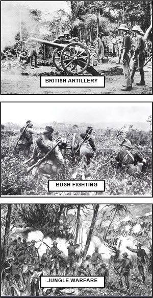 When war broke out, the German colony was surrounded on all sides by Allied territory – British Nigeria to the northwest, the Belgian Congo to the southeast, and French Equatorial Africa to the south and east. And in addition, the German military force stationed in the colony at that time only numbered around 1,800, and local recuits were no more than 6,000. In contrast, French Equatorial Africa alone could muster 20,000 soldiers, and British Nigeria had a force close to 7,500. However, this imbalance in favour of the Allies (at least two to one) was somewhat mitigated by the territory over which the battle had to be fought. Kamerun was a vast, sparsely inhabited area made up of rugged terrain and dense jungle, the thick ground cover associated with tropical rain forests. This not only made the going slow and arduous, but also provided ample opportunity for small guerrilla bands to return to areas thought to have been “taken”. In January 1915, for example, they mounted an attack at Edéa, “conquered” three months earlier, and, likewise, they made a sudden return to Bertoua in July. There were no clear, determined battle lines in such terrain. Indeed, at one time the Germans made a sudden raid into northern Nigeria, and for most of the conflict they held on to the mountainous region in northern Kamerun. And lastly, but by no means least, were the tropical diseases to be endured – and often not endured – in this equatorial region. Malaria and Yellow Fever in particular, took the lives of many men, often more than those lost in battle. This was a dangerous and demanding battle zone.