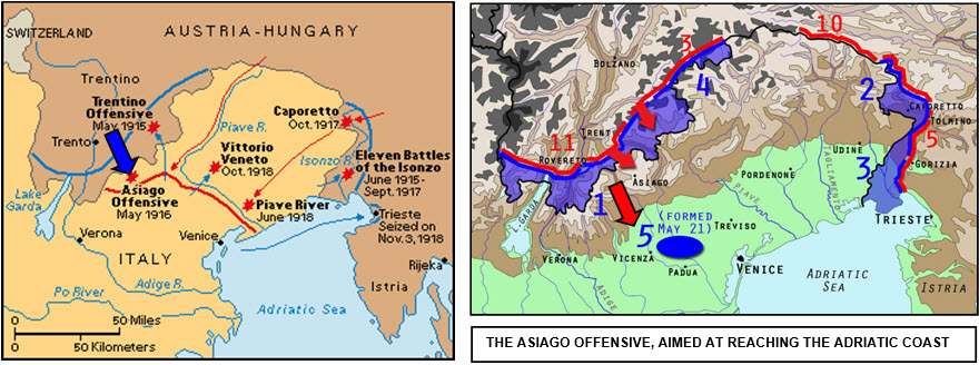 The offensive appeared to be well-timed. The Isonzo sector was quiet following the Italians’ fifth failure to make an incursion, and the situation in the Balkans and on the Russian front seemed sufficiently stable to justify a major assault elsewhere. The Italians, of course, were well aware of the build up of enemy forces in the Trentino, and had warned their First Army to prepare for a likely attack, but the 18 divisions assigned to the offensive outnumbered the Italian forces by four-to-one, and the 2,000 guns provided a clear superiority in artillery. Furthermore, the commander of the First Army, General Roberto Brusati, preoccupied with preparing for a local attack of his own, did not take the warning too seriously. Thus, when, on May 15th – following a massive barrage by some 2,000 guns – the Austro-Hungarian Third and Eleventh armies, under the command of Archduke Eugen of Austria, launched a powerful attack along a 30 mile front, they made impressive substantial gains. Within three days they had overrun the Italian trenches at Soglio d’Aspio, and seized the key mountain peaks of Zugna Torta, Monte Maggio, and Cimi di Campulozzo. Then, by the end of May, having left behind most of the tough alpine terrain, they had taken Asiago (though not wthout some extremely fierce fighting), and advanced some miles across Italy’s northern plain towards Vicenza (see map right above). There were even fears that the Italians might have to withdraw to defend the city of Venice, just 42 miles distant.