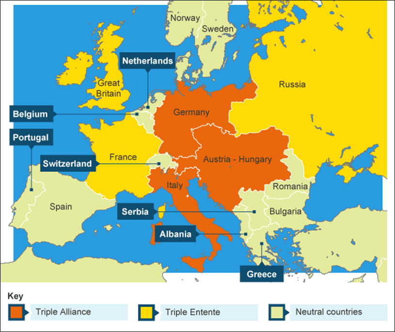 The establishment of the German Empire in 1871, following its decisive victory over France, shattered the balance of power in Europe. Germany’s determination to become the strongest nation on the continent and a world power to boot, posed a serious threat to peace, as did Germany’s pact with Austria Hungary in 1879, and with Italy three years later. The Triple Alliance encompassed the whole of central Europe, from the Baltic to the Mediterranean. In addition, in the 1890s Germany launched an ambitious programme to increase its naval power and – at the very least – outnumber the British home fleet. It is not surprising that Britain needed to readjust the balance, at almost any cost. As a result, in 1902, abandoning its historical policy of “splendid isolation”, it joined an alliance with Japan, thereby reducing its naval commitment in the Pacific. Then followed the Entente Cordiale with France in 1904 – a momentous change of diplomatic alignment – and the Entente with Russia in 1907, giving Germany a war on two fronts if war were to come. In fact, when it did come, as we shall see, it was not the Entente agreements that brought Britain into the war, but a defence pact made with Belgium back in 1839.